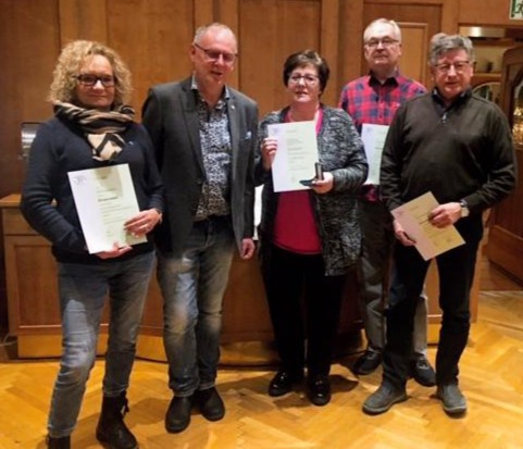 Nur wenige der zu ehrenden Mitglieder waren gekommen. Von links Ferdinand Sperber, Gerald Hruby, Rosemarie Selch, Reinhard König (alle für 25 Jahre), sowie Zweiter Vorsitzender Karl Kunz. Reinhard König wurde in der Generalversammlung für zwei weitere Jahre im Amt bestätigt. Weiter im Vorstand sind als stellvertretender Vorsitzender Karl Kunz, Kassiererin Helene Kunz, Schriftführer Harald Sommer, Stellvertreterin Waltraud König. Kassenrevisoren sind Gerald Hruby, Stefan Hart und Bruno Salomon. Beisitzer sind Jürgen Bomann, Bettina Bomann, Wolfgang Heinl und Thomas Bomann. Der Posten des Gerätewarts, den viele Jahre der kürzlich verstorbene Rudolf Heinl inne hatte, bleibt zunächst unbesetzt. König erinnerte bei dem Treffen im Gasthof Bayerischer Hof an die Arbeit in den vergangenen beiden Jahren und erwähnte dabei Mitgliederversammlungen zu aktuellen Themen – mit Rainer Fischer zum Thema „Rente und Steuern“ und mit Notarin Sonja Pelikan zum Thema „Erben und Vererben – Übergabe zu Lebzeiten“. Außerdem seien Heizöl-Sammelbestellungen organisiert worden. Diese werde es künftig nicht mehr geben: Als Gründe nannte König den Datenschutz und die Gesamtschuldnerhaftung der Besteller.Als angespannt bezeichnete König die Situation beim Gerätewart. Hier werde dringend jemand gesucht. Derzeit übernehmen er, König, sowie Luise Heinl vorübergehend den Verleih sowie die Pflege und Wartung der Geräte. Weiter berichtete der Vorsitzende von der Bezirksversammlung in Regensburg. König wurde als Delegierter zur Landesversammlung im Oktober in München gewählt. Die Zahl der Mitglieder im Ortsverein Waldsassen bezifferte der Vorsitzende auf 380 Personen. Weiter stand die Ehrung langjähriger Mitglieder auf der Tagesordnung. Leider waren nur wenige der zu Ehrenden gekommen. Es gab jeweils eine Urkunde, eine Ehrennadel und ein Präsent. 50 Jahre bei der Siedlergemeinschaft sind Anneliese Ascherl, Dorothea Dorschner, Alfons Haberkorn, Karl Roth und Margarete Wild. 40 Jahre dabei sind Reinhard Erl, Apollonia Hahn, Kurt Roppert, Otto Summer und Karl Vetter. 25 Jahre Mitglied sind Peter Christ, Thomas Dendorfer, Jürgen Faltenbacher, Angela Fendl, Erna Franz, Angela Fräsdorf, Adolf Fuhrmann, Elfriede Gammanick, Rainer Gerl, Heinrich Heinl, Christiane Hencke, Gerald Hruby, Bruno Jergens, Reinhard König, Reinhard Ott, Stefan Schnurrer, Rosemarie Selch, Ferdinand Sperber, Ernst Thümling und Heinrich Wichary.