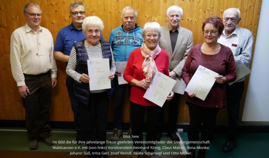 Irine Wagemann, Reinhard König, Helene Kunz, Angelika Hausner, Wolfgang Heindl, Harald Sommer, Irene Wagemann, Helene Kunz Manfred Schwägerl, Werner Keisinger Reinhard König und Christian Rosener Mitgliederversammlung vom 27.11.2025 Siedlergemeinschaft Waldsassen vor Auflösung bewahrt! Bei der Mitgliederversammlung der Siedlergemeinschaft Waldsassen war zu Beginn nicht Sicher, ob die Position des 2. Vorsitzenden und des Kassenwarts besetzt werden kann. Nach der Begrüßung, den Berichten des Vorstandes, der Kassier: in und der Revisoren, kam der Punkt Neuwahlen. Nach langen Diskussionen konnte die komplette Vorstandschaft gewählt werden. 1.Vorsitzender ist weiterhin Reinhard König. Für den 2. Vorsitz konnte Frau Irene Wagemann gewonnen werden. Für den 1. Kassier erklärte sich Christian Rosner bereit, mit Hilfe von Helene Kunz zur Einarbeitung als 2. Kassier:in, das Amt zu übernehmen. Schriftführer ist weiterhin Harald Sommer. Kassenrevisoren sind Stefan Hart und Bruno Salomon. Als Beisitzer wurden Wolfgang Heindl, Maria Meyer, Angelika Hausner und Gerald Hruby gewählt. Dann konnten die Ehrungen vorgenommen werden. Für besondere Verdienste um den Verein wurden Helene und Karl Kunz mit der Silbernen Ehrennadel und einer Urkunde vom Eigenheimerverband Bayern ausgezeichnet. Für langjährige Mitgliedschaft wurden für 25, 40, 50 und 60 Jahre geehrt. Leider waren nur 3 Mitglieder anwesend. Viele hatten sich entschuldigt. So konnte Irene Wagemann für 25 Jahre, Manfred Schwägerl und Werner Keisinger für 40 Jahre geehrt werden.